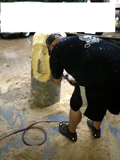 My Bug has ventured into the world of chainsaw carving, and has started on an Easter Island Moai Head carving. He made is own version of a handheld, air-powered chainsaw that looks pretty mean.